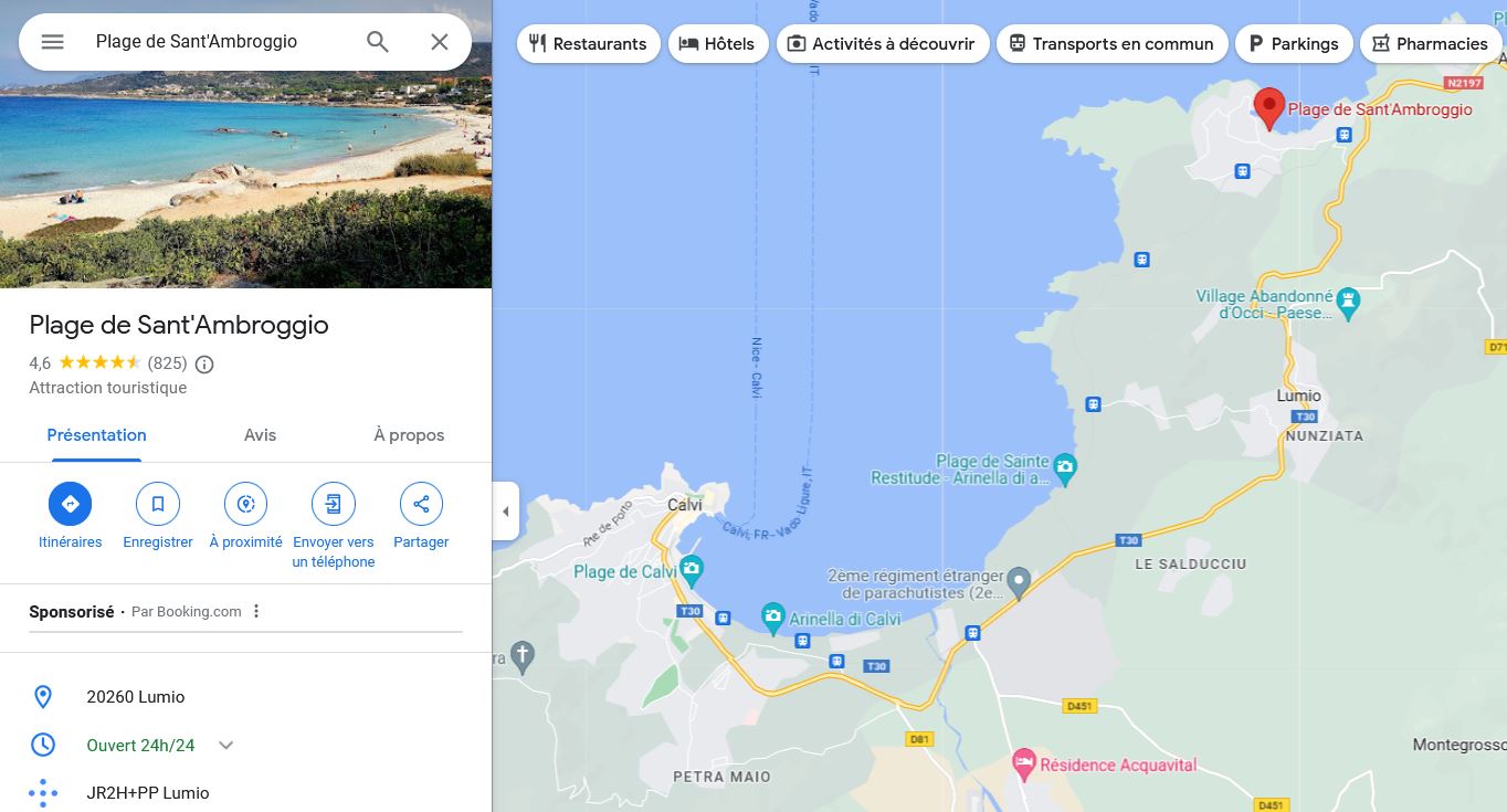 La deuxième plage à l'abri du vent d’Ouest, 3 km après avoir quitté Lumio en direction de L’Ile Rousse, surveiller sur votre gauche en grand panneau « Marine de Sant'Ambrogio ».